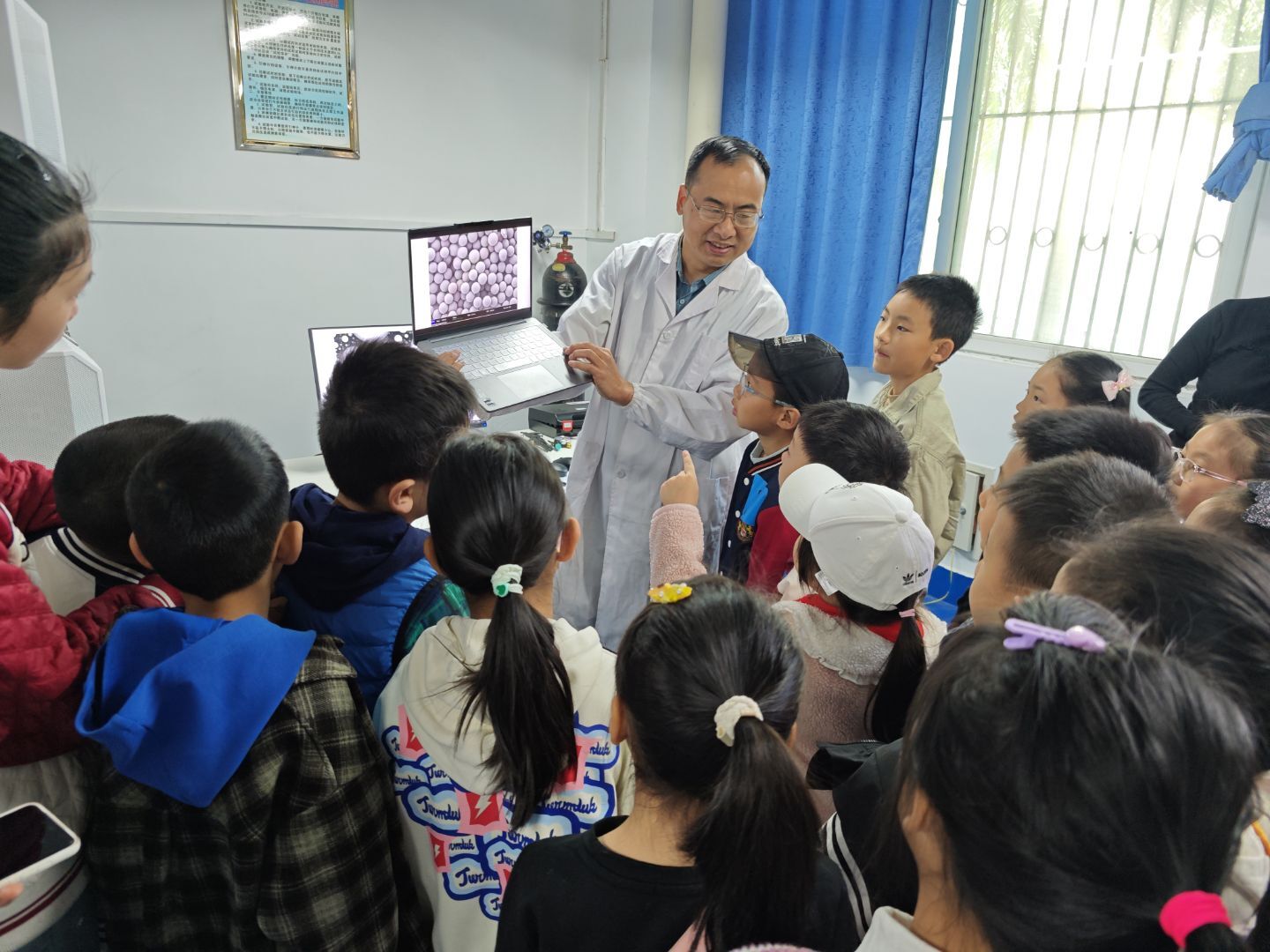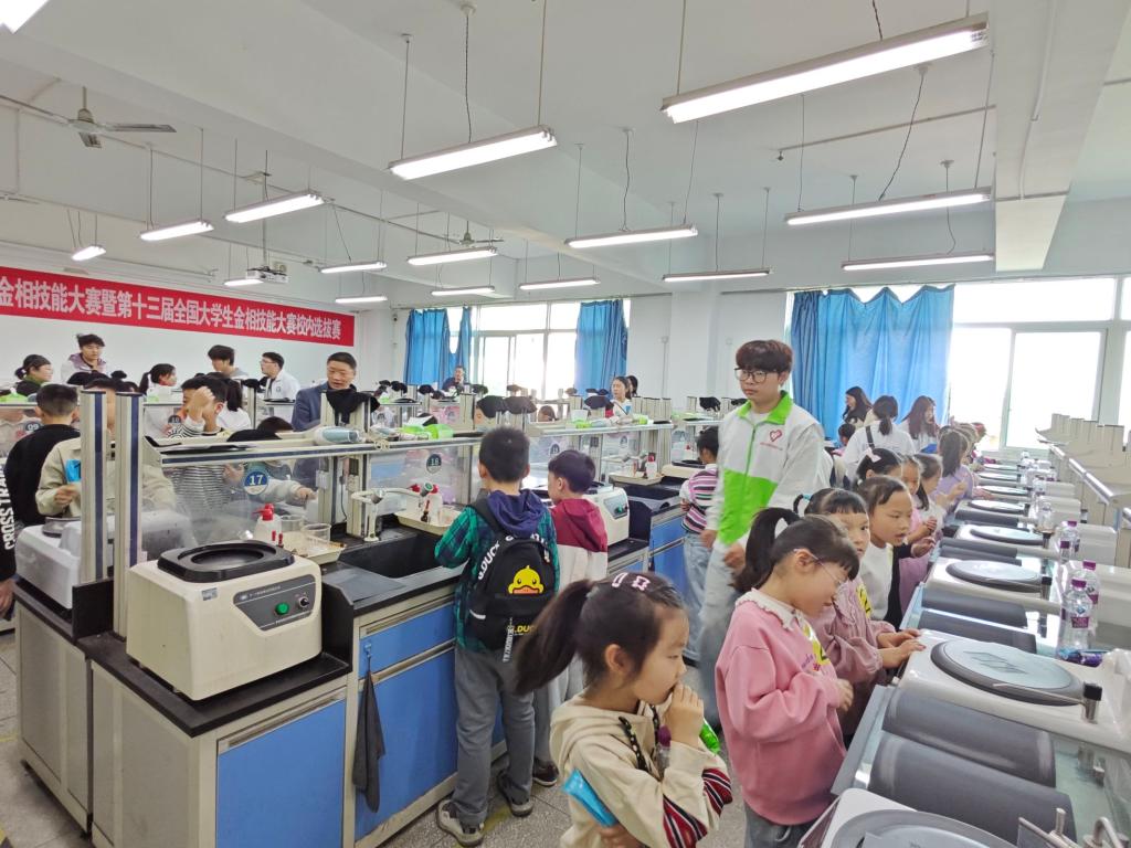 随后由金相大赛国赛一等奖团队成员带领小学生们参观金相实验室,并指导大家动手磨金相、利用金相显微镜观察钒钛产品的金相显微组织。特别设置的互动环节让参观者亲手操作实验,通过亲身体验科学实验感受科学原理在实际中的应用。