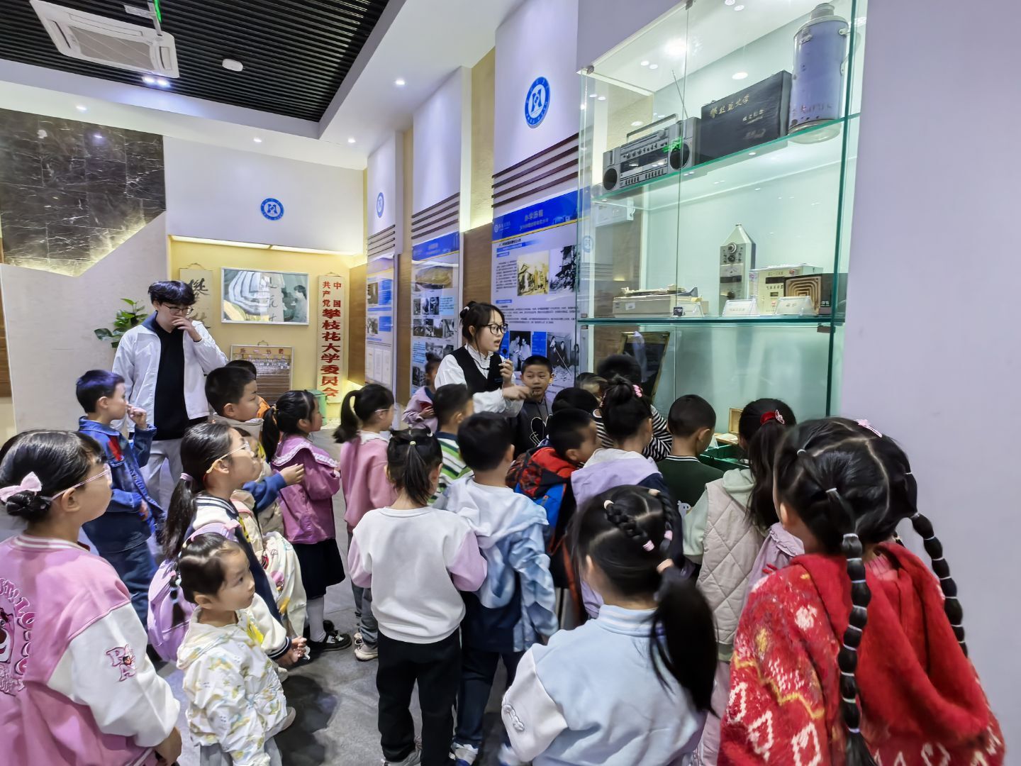 在校史馆,宣讲团成员用生动的语言讲述了学校的发展历程和辉煌成就。孩子们和家长一同聆听,见证攀大的成长与变迁。