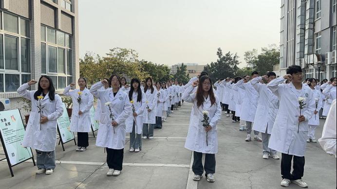 上午9时,全体人员肃立默哀,向遗体捐献者致敬。市红十字会领导在致辞中表示,遗体捐献者为医学教育提供了重要教学资源,应当持续强化医学人文教育,引导学生践行“敬畏生命、精进医术”的初心。捐献者家属代表回顾了亲人自愿捐献遗体的过程,她表示,亲属生前基于推动医学进步的考量捐献遗体,既是生命最后的奉献,亦是对“人道、博爱、奉献”精神的切实践行。受捐者代表分享了接受器官移植后重获健康的经历,呼吁社会关注遗体与器官捐献事业。随后,全体医学生重温《医学生誓言》,仪式最后,全体人员向遗体捐献者敬献上代表高洁和追思的菊花,表达感恩和尊敬。