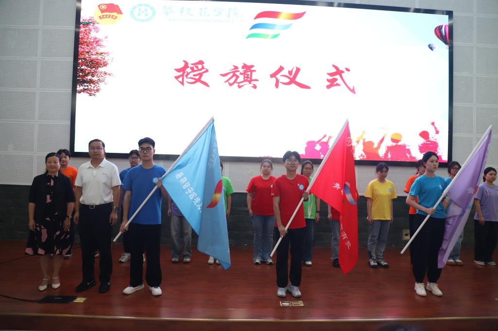 最后,参会领导为“共富先锋”集中实践团、研究生实践团队——“攀研·共富七彩童行”实践团和各二级学院暑期社会实践团队授旗。
