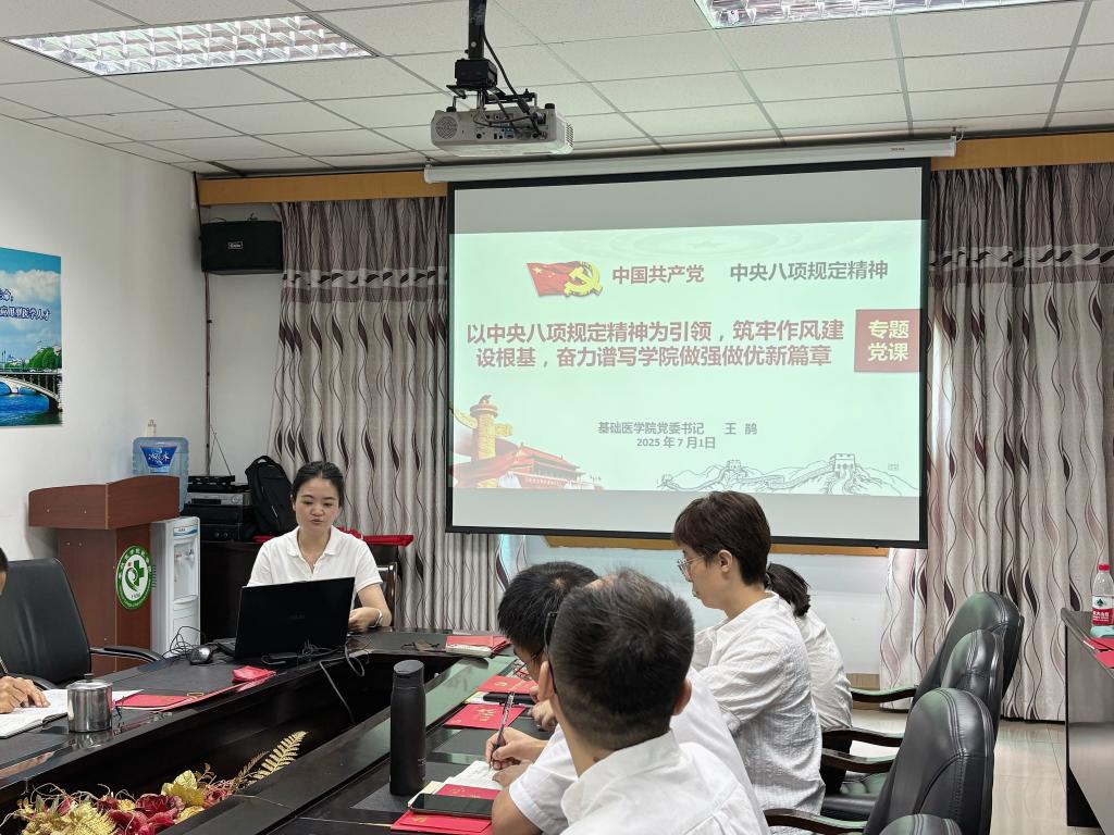 7月1日下午,学院党委在笃行楼三楼会议室开展“政治生日”专题会。党委书记王鹃向教师党员赠送“政治生日”贺卡和《中国共产党纪律处分条例》红色书籍,希望大家铭记入党初心,坚守纪律底线;党组织书记与党员们谈心谈话并送寄语;党员代表发表政治生日感言;王鹃讲授《以中央八项规定精神为引领,筑牢作风建设根基,奋力谱写学院做强做优新篇章》专题党课;组织员宣读《2025年基础医学院“大德大爱大师 承诺亮诺践诺”通知》,安排党员教师为学生办实事工作。