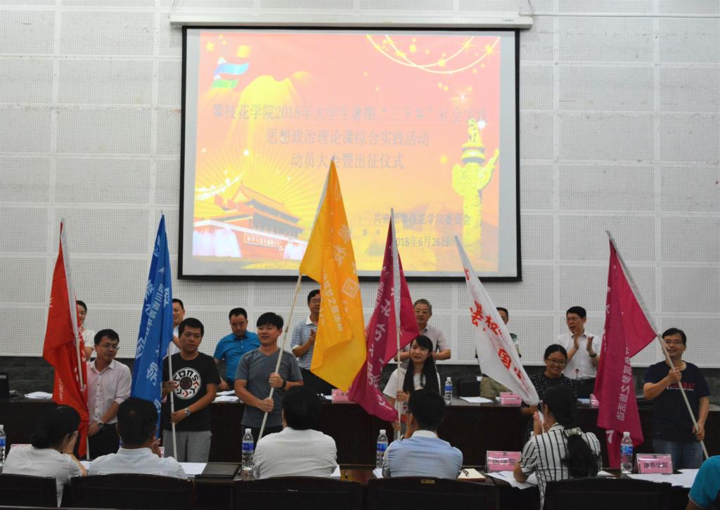 校领导及相关部门负责人为2018年暑期社会实践团队和“青年红色筑梦之旅”实践团队授旗。