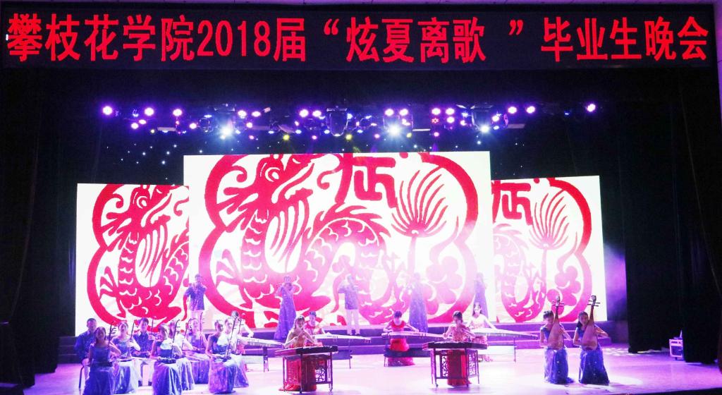 一曲民乐《喜洋洋》合奏开启了晚会“阳光作伴 木棉花开”、“静明筑梦不负韶华”、“炫夏离歌 青春转场”三大篇章。民族舞蹈、歌曲联唱、情景剧等精彩节目接踵而至,毕业生们以其独特精彩的歌舞表演,放飞青春,筑梦远航,赢得了在场观众的阵阵掌声。原生态舞蹈《阿噻噻,咿噻噻》、《阿哒哒》等节目讲述着绽放的青春、飞扬的梦想、崭新的期望,歌伴舞《当兵前的那晚上》表现出男儿当兵为祖国的魄力,令在场观众热血沸腾。配乐诗朗诵《别了,我的大学》勾起了同学们对大学生活的无尽回忆,每句话都烙入人心。合唱《雪花的快乐》用欢快的节奏、跳跃的音符展现了大学生的青春与活力。晚会在管乐合奏表演《攀枝花学院之歌》中圆满落下帷幕。