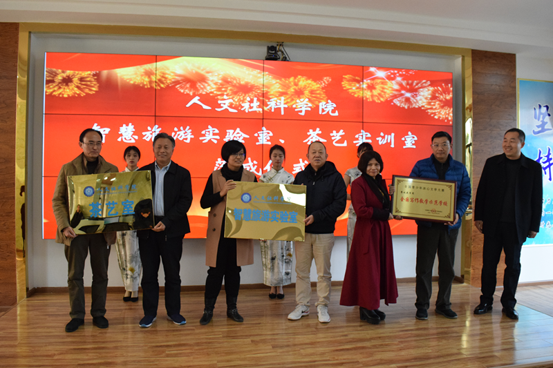 校领导为智慧旅游实验室、茶艺实训室、写作实训基地授牌