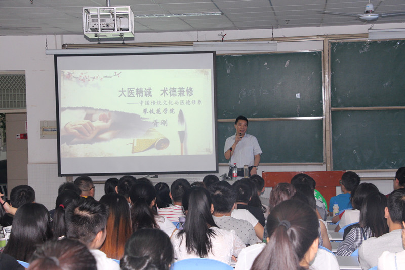 9月26日,校党委副书记胥刚在西苑笃行楼J1-1教室作题为“大医精诚术德兼修——中国传统文化与医德修养”的讲座,2015级临床本科专业的100余名学生以及医学院、康养学院、附属医院的40余名教师听取了本次讲座。