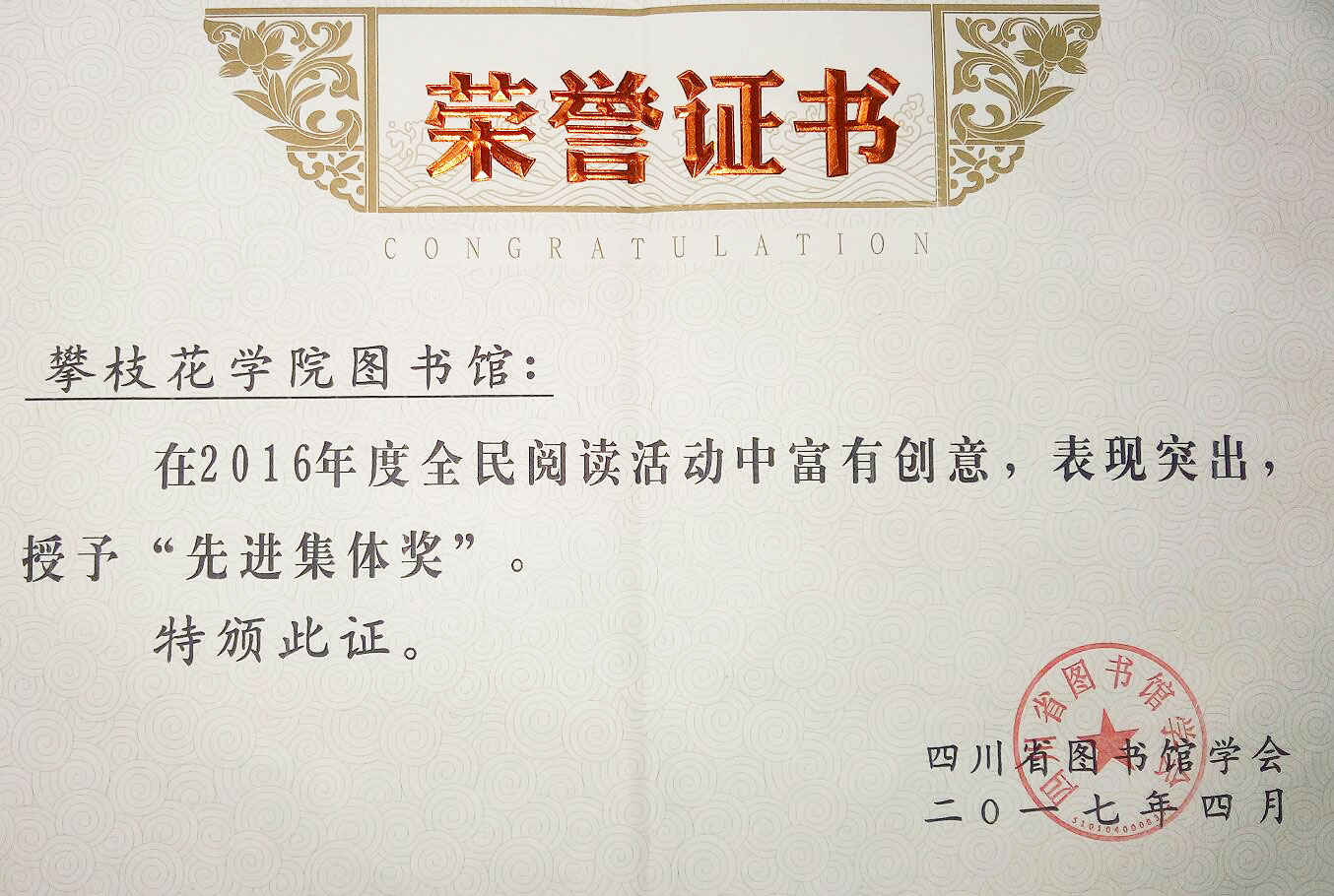 经过四川省图工委严格评审,2017年4月我校图书馆在全省各级各类图书馆激烈的角逐中脱颖而出,被评为2016年度“全民阅读先进集体”。